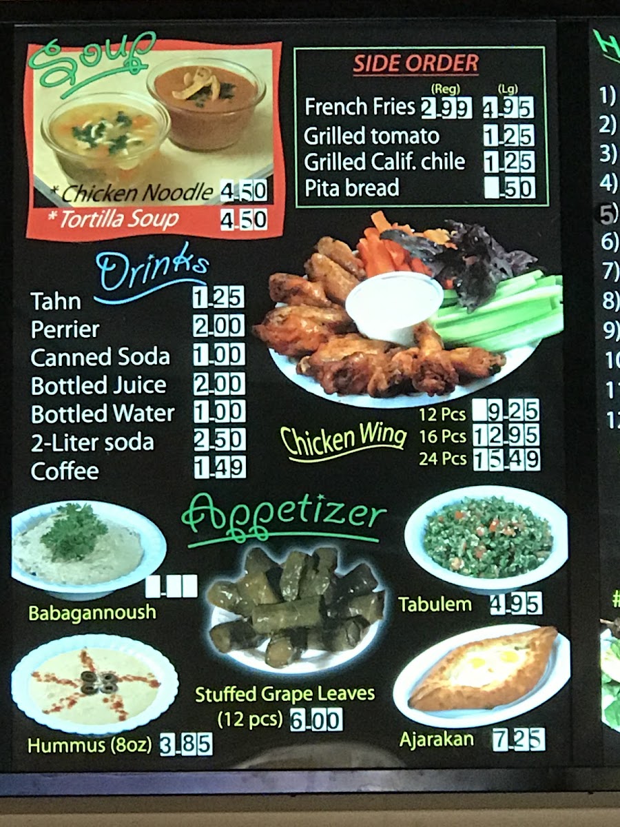 Beef, salad, hummus, rice or fries, grilled tomato, california chili and pita bread.