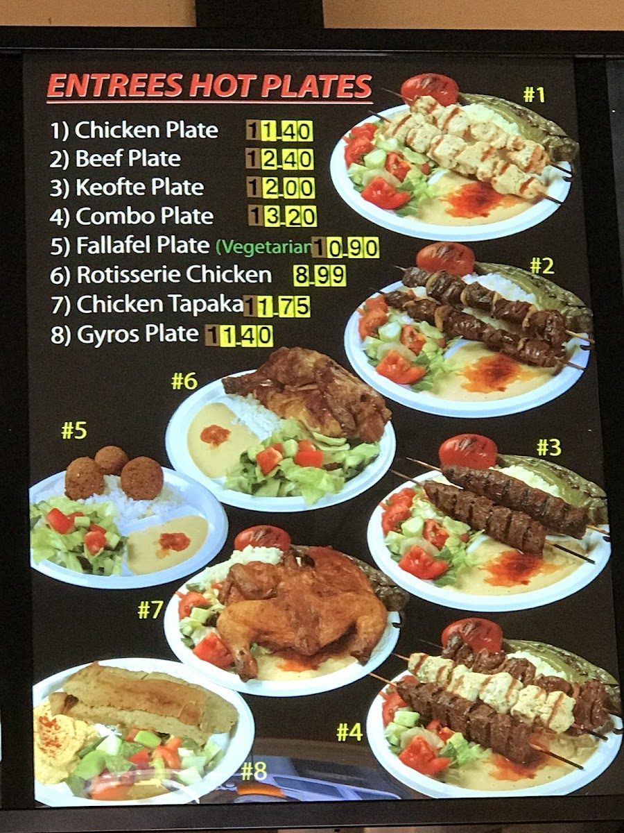 Grilled chicken, Kofte, beef, salad, hummus, rice or fries, grilled tomato, california chili and pita bread.